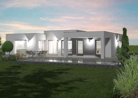 Ziehen Sie einen Bungalow für Ihr neues Zuhaus in Erwägung ? Hier präsentieren wir Ihnen einen exklusiven Entwurf, der höchsten Anspüchen genügt. Die Dreigliederung des Baukörpers wird durch die Überhöhung des mittleren Bereichs erzeugt. Durch den Vorsprung für das Wohnzimmer und die massive Überdachung im Bereich der Küche entsteh ein kleiner "Innenhof".