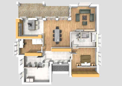 Die komplette Planung(Grundrisse, Ansichten, Schnitte, Bautragspläne), Mengenberechnung, Kalkulation und Visualisierung dieses Hauses wurde erstellt mit der Software Bauset-Hausplaner.